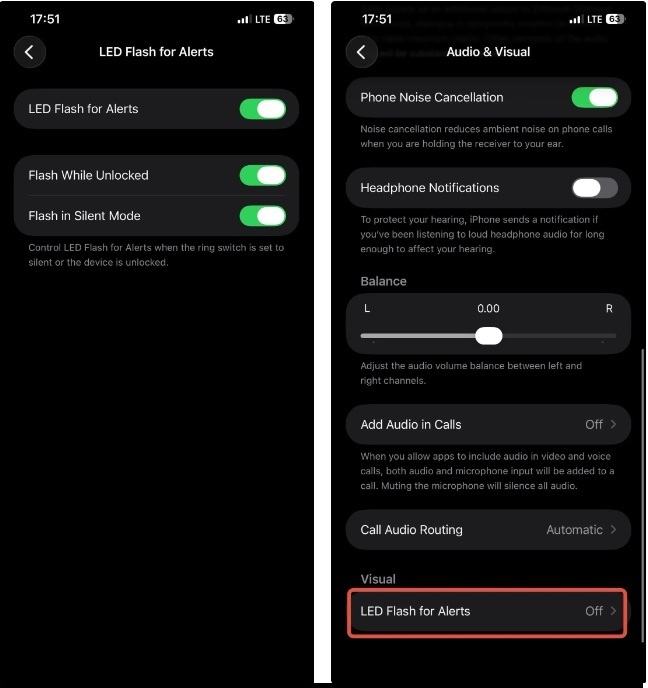 به مسیر Settings > Accessibility > Audio/Visual > LED Flash for Alerts بروید و گزینههای فعال را خاموش کنید.