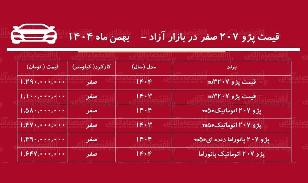 قیمت پژو ۲۰۷ اتوماتیک TU5P از ابتدای دی‌ماه تاکنون ۵۰ میلیون تومان رشد را تجربه کرده و هم‌اکنون یک میلیارد و ۵۸۰ میلیون تومان معامله می‌شود.