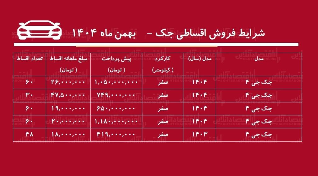 همچنین جک J۴ اتوماتیک با پیشپرداخت ۷۴۹ میلیون تومان و اقساط ماهانه ۴۷ میلیون و ۵۰۰ هزار تومان در قالب ۳۰ قسط در لیست فروش اقساطی قرار گرفته است.
