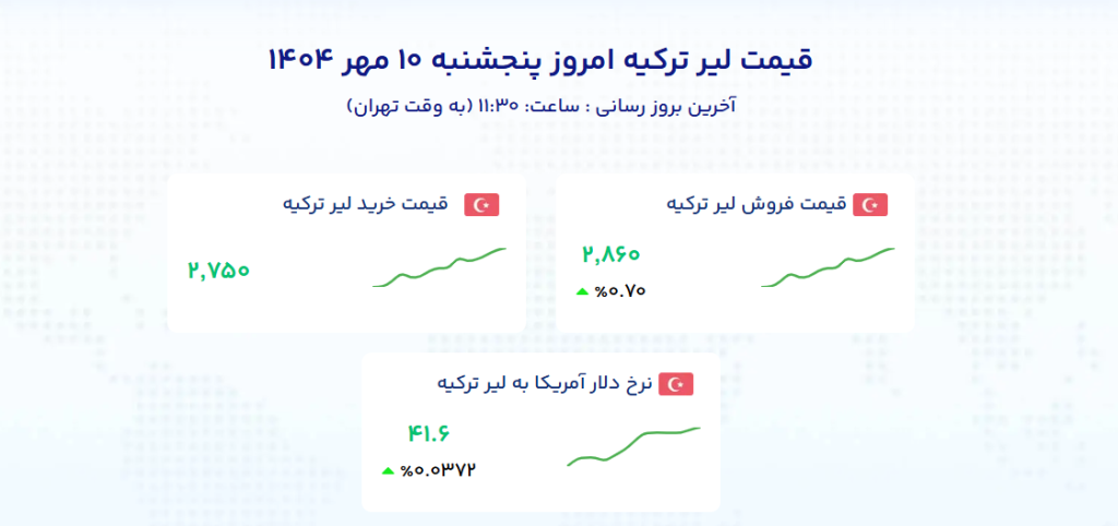 قیمت لیر ترکیه امروز پنجشنبه ۱۰ مهر ۱۴۰۴، در بازار ۲,۸۶۰ تومان است که نسبت به دیروز ۲۰ تومان (۰.۷۰ درصد) افزایش یافته است. هر لیر ترکیه، دیروز با قیمت ۲,۸۴۰ تومان معامله میشد.